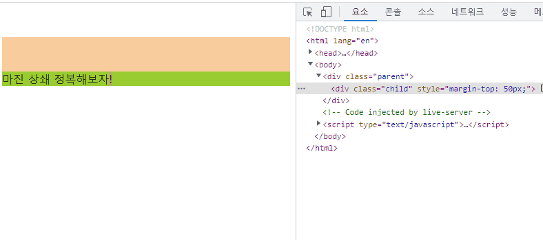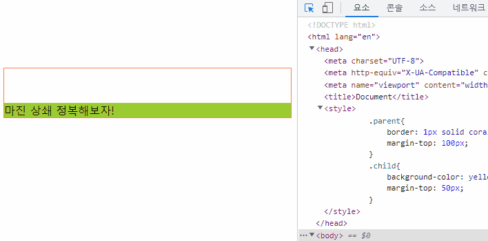 아까와 마찬가지로 border 값 (시각적 요소)를 없애자 margin 겹침 현상이 일어나는 것을 볼 수 있음.